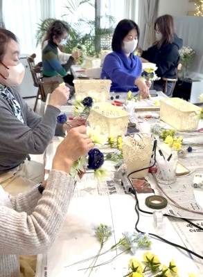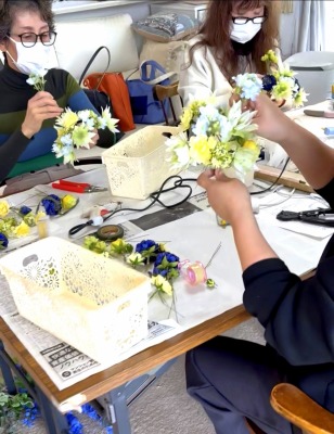 | そのうえからしっかり一度だけ、ワイヤー固定します。間にあるセロテープがクッションとなり、ぐっとしめることが出来ます。 このとき固定するワイヤーは24番の方がスムーズにフィットします。 本当にセロテープ便利です!!アレンジのハードルが下がり、誰もが参加しやくなりました。 |