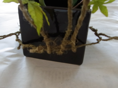 器がはいるか時々チェックしましょう器をいれて、雰囲気をみながら、24番ワイヤーを3~4等分にして、ラスティックワイヤーが交差するところを止めます。