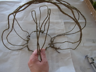 (1) ラスティックワイヤーを2メートルX3と 50センチを用意します。2本を半分におり、1本は3等分におります。50センチで土台の円をつくります。器がその円に入るかチェックしておきます。