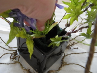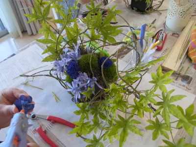 (6) 対角に紅葉をいれ、ほかの花材も適宜使いやすい長さにカットしておきます。