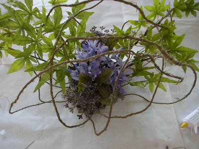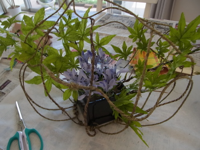 (7) ラスティックワイヤードームが完成したら、モミジのアレンジをセットします。