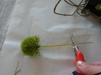 (8) 他の花材を適当な長さにカットし、ドームの中に挿していきます。