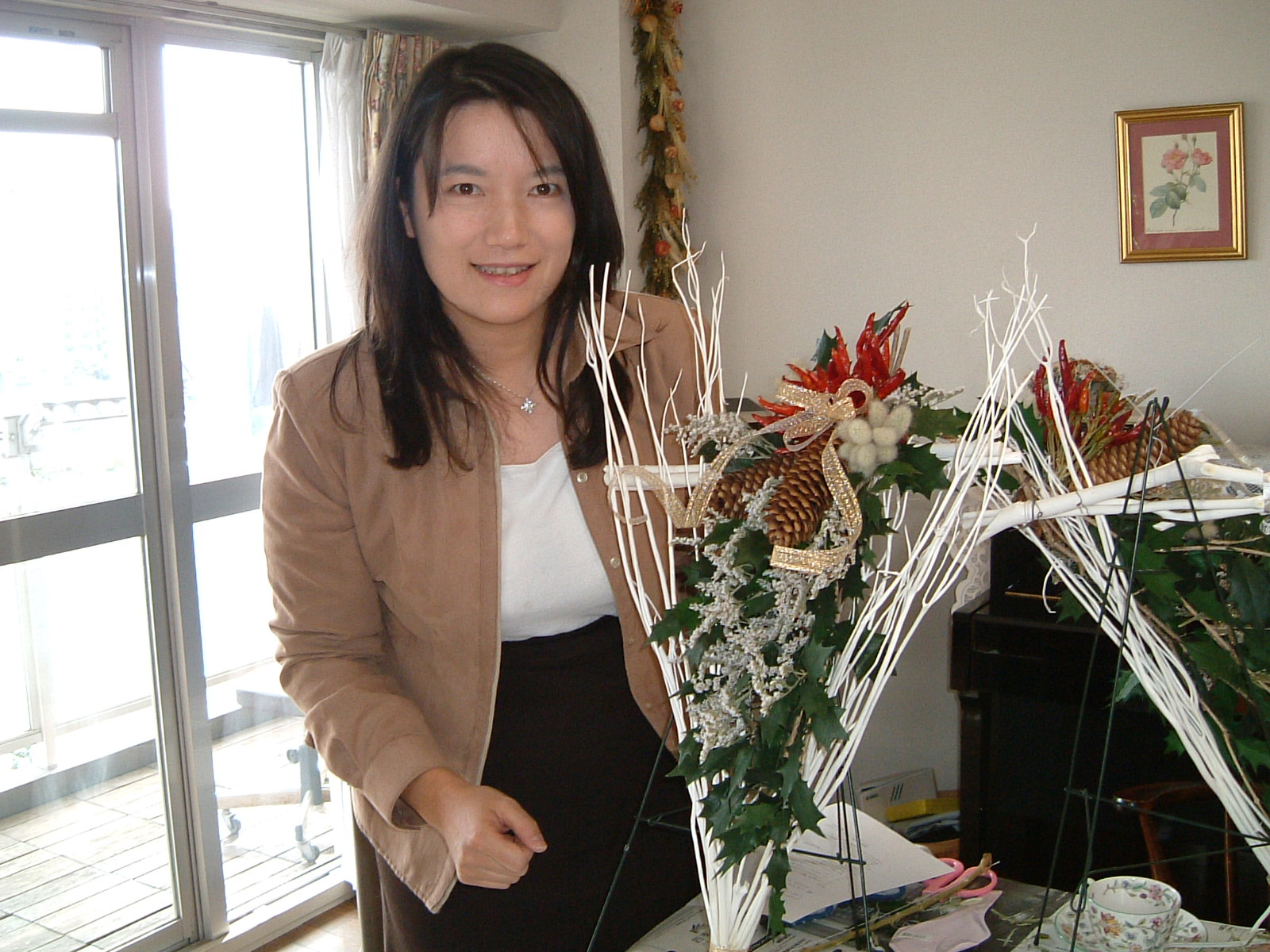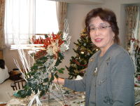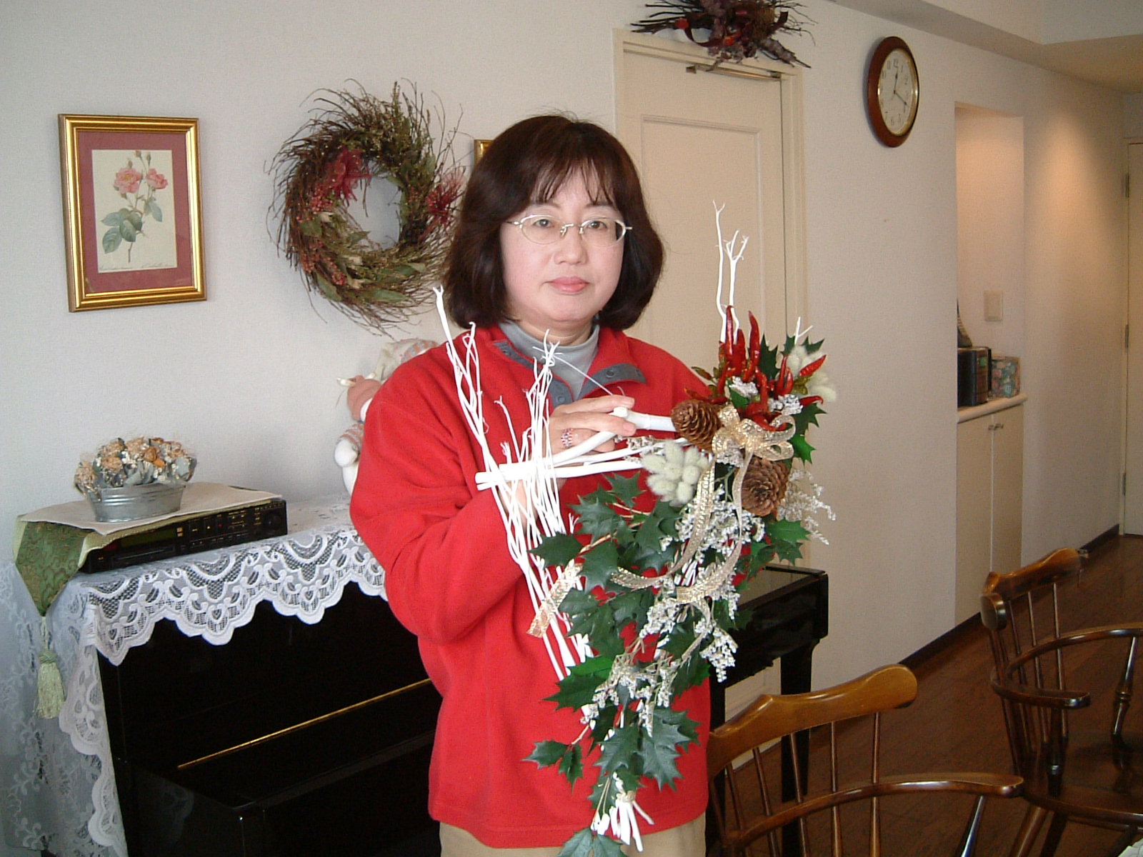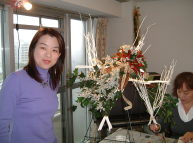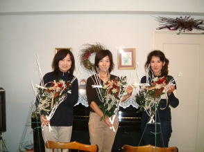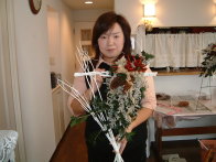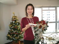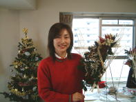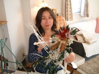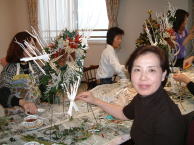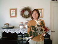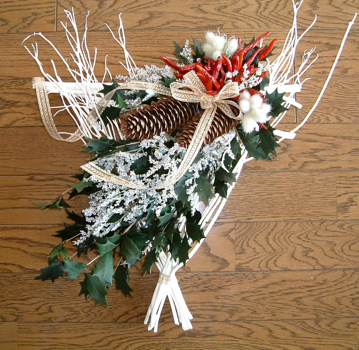 こちらは2003年12月のお教室で作品です。ヒイラギのシルエットがとても素敵なクリスマススワッグです。(花材:ヒイラギ、デュモサ、ドイツトウヒ、唐辛子、ミニラグラス、三又さらし、リボン)バックのベースも手作りです。ヒイラギの緑と元気な唐辛子の赤がとても映えます。 お教室ではお手本を見ながら、同じ花材で、制作しているはずなのですが、出来あがったみなさんの作品は、お1人お1人まったく表情がちがいましたね。そこには個性の素晴らしさと、天然素材の面白みがあります。太い枝をきったり、ごつごつした実を取り付けたり、ちょっと格闘しながらも、出来上がった作品をとても喜んでいただけて、笑顔でお持ち帰りいただけたことが、私も本当に嬉しかったです。さて、みなさん、部屋のどこに飾られたのでしょうか?
