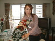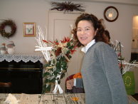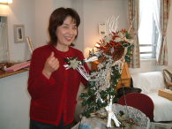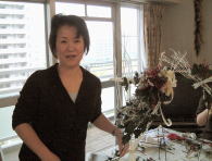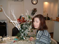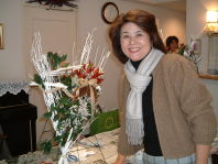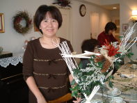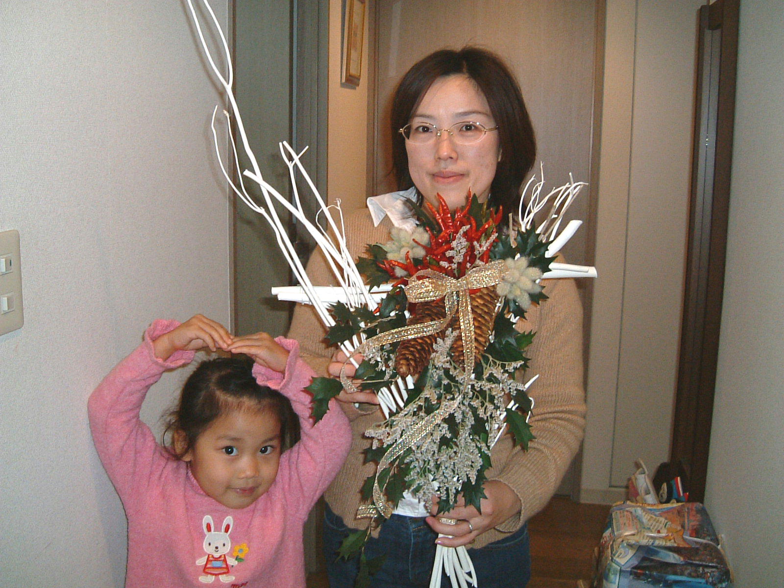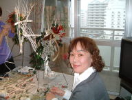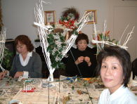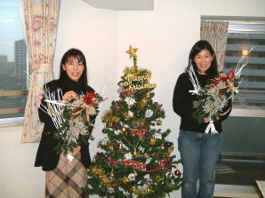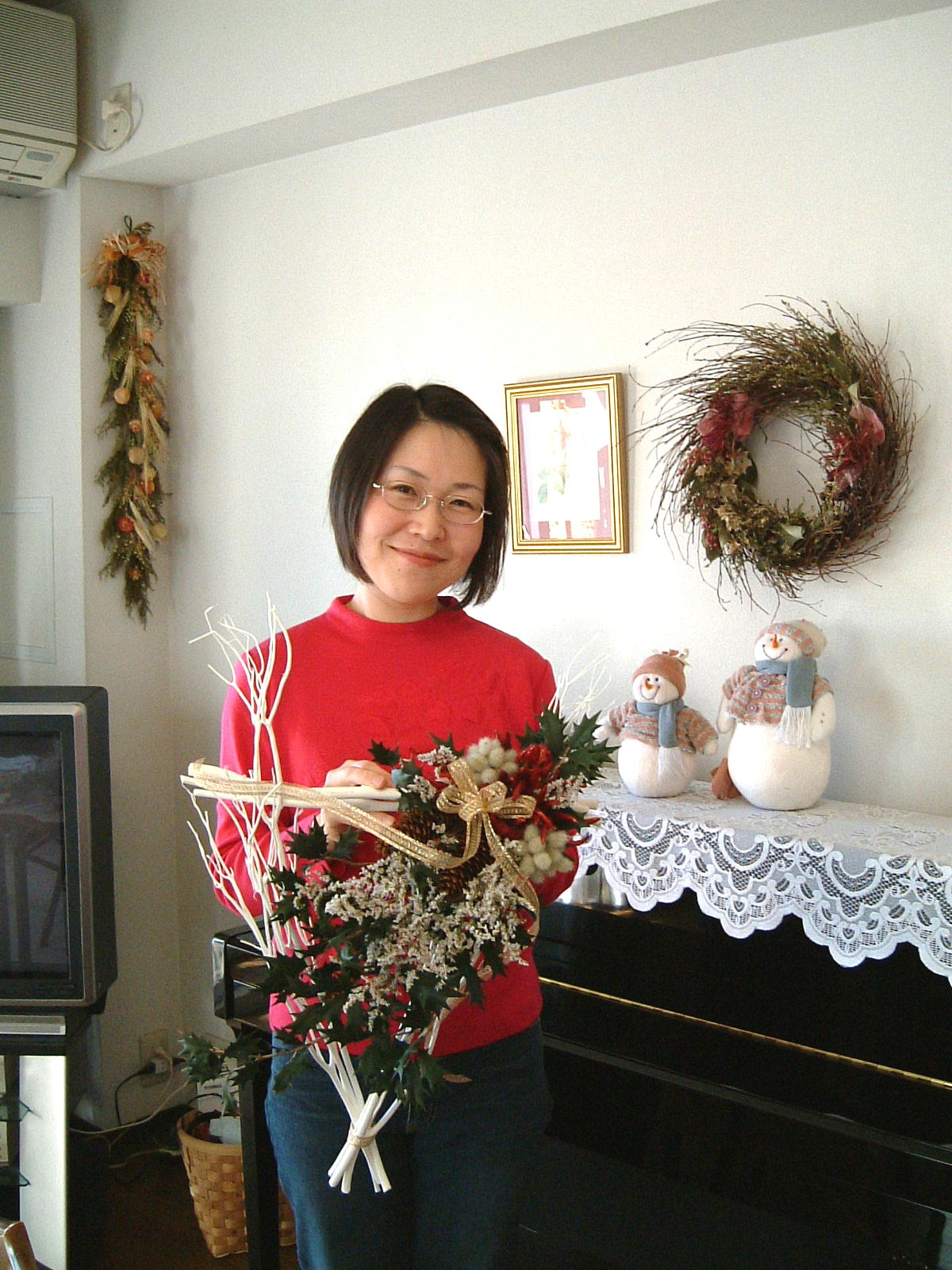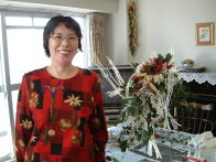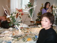 こちらは2003年12月のお教室で作品です。ヒイラギのシルエットがとても素敵なクリスマススワッグです。(花材:ヒイラギ、デュモサ、ドイツトウヒ、唐辛子、ミニラグラス、三又さらし、リボン)バックのベースも手作りです。ヒイラギの緑と元気な唐辛子の赤がとても映えます。 お教室ではお手本を見ながら、同じ花材で、制作しているはずなのですが、出来あがったみなさんの作品は、お1人お1人まったく表情がちがいましたね。そこには個性の素晴らしさと、天然素材の面白みがあります。太い枝をきったり、ごつごつした実を取り付けたり、ちょっと格闘しながらも、出来上がった作品をとても喜んでいただけて、笑顔でお持ち帰りいただけたことが、私も本当に嬉しかったです。さて、みなさん、部屋のどこに飾られたのでしょうか?