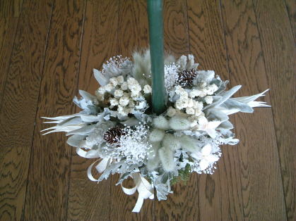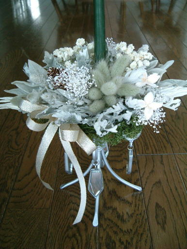 今年はキャンドルスタンドのアレンジです。ホワイトとグレイッシュなグリーをベースにしてみましたアレンジはキャンドルの足元にキュットした感じがとても似合います。両サイドのとんがりはオクラを使い、全体にひし形のシャープ印象で。自然のままのなんともいえない微妙なグラディエーションカラーが魅力です。