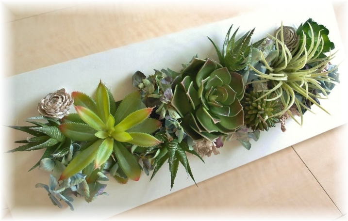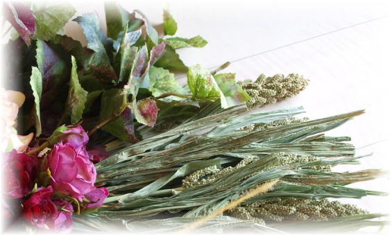 写真はアートフラワーの葉っぱでつくった額のアレンジです。リサイクルが時代にマッチしているためか、マスコミで注目されました。一般にアレンジは花を主役で使うため、どうしても葉っぱばかりが残ります。前述のとおりアーティフィシャルは高品質素材なだけに、よくみると葉も実に精巧につくられています。もったいないので処分せず、集めて額につくってみました。すると見違えるような、立派なオブジェにできあがりました。こんなアレンジも作ります